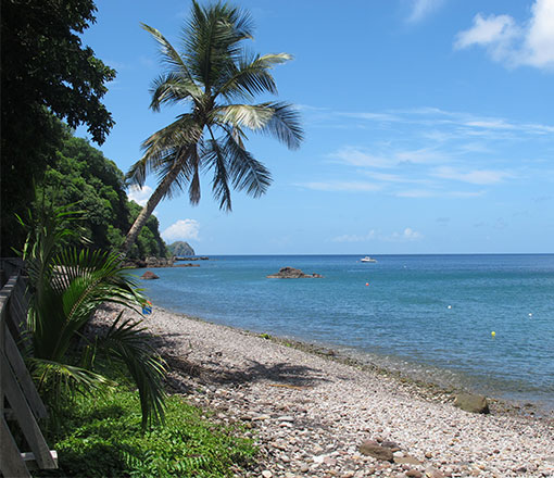 Driving south, past Point Michel, the entrance to the beach is marked by the sign "Irie Safari".