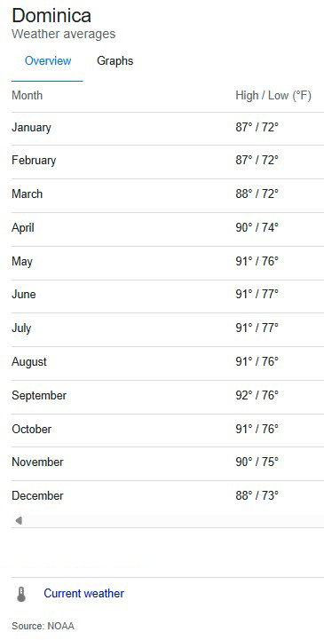 Dominica’s average daily temperatures range from about 75°F (24°C) to 85°F (29°C). Annual rainfall in Dominica varies considerably, from 50 inches along the coast, to over 300 inches in the interior. Traditionally, there has been a dry season between February and June, with the wettest months being August to October. The peak of hurricane season is in late August/early September. Expect cooler nights in the higher elevations… and light showers at any time!